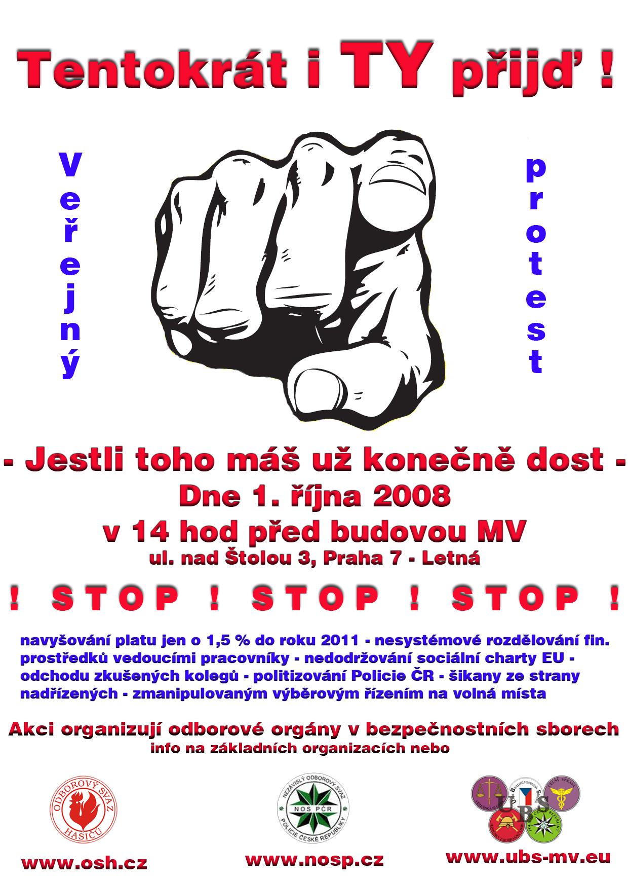 Dnes jsme se společně se zástupci UBS MV zúčastnili části jednání Výboru NOS PČR a dohodli jsme další koordinaci pořádání demonstrace za lepší podmínky výkonu služby příslušníků bezpečnostních sborů, která se bude konat 1. října 2008 od 14 hod., před budovou MV ČR, Nad Štolou 3, Praha 7. Podrobnosti k pořádání protestu najdete v přiloženém plakátu. Sledujte aktuality na www.osh.cz , zde budeme průběžně informovat o přípravě demonstrace.Zdeněk J. Oberreiter