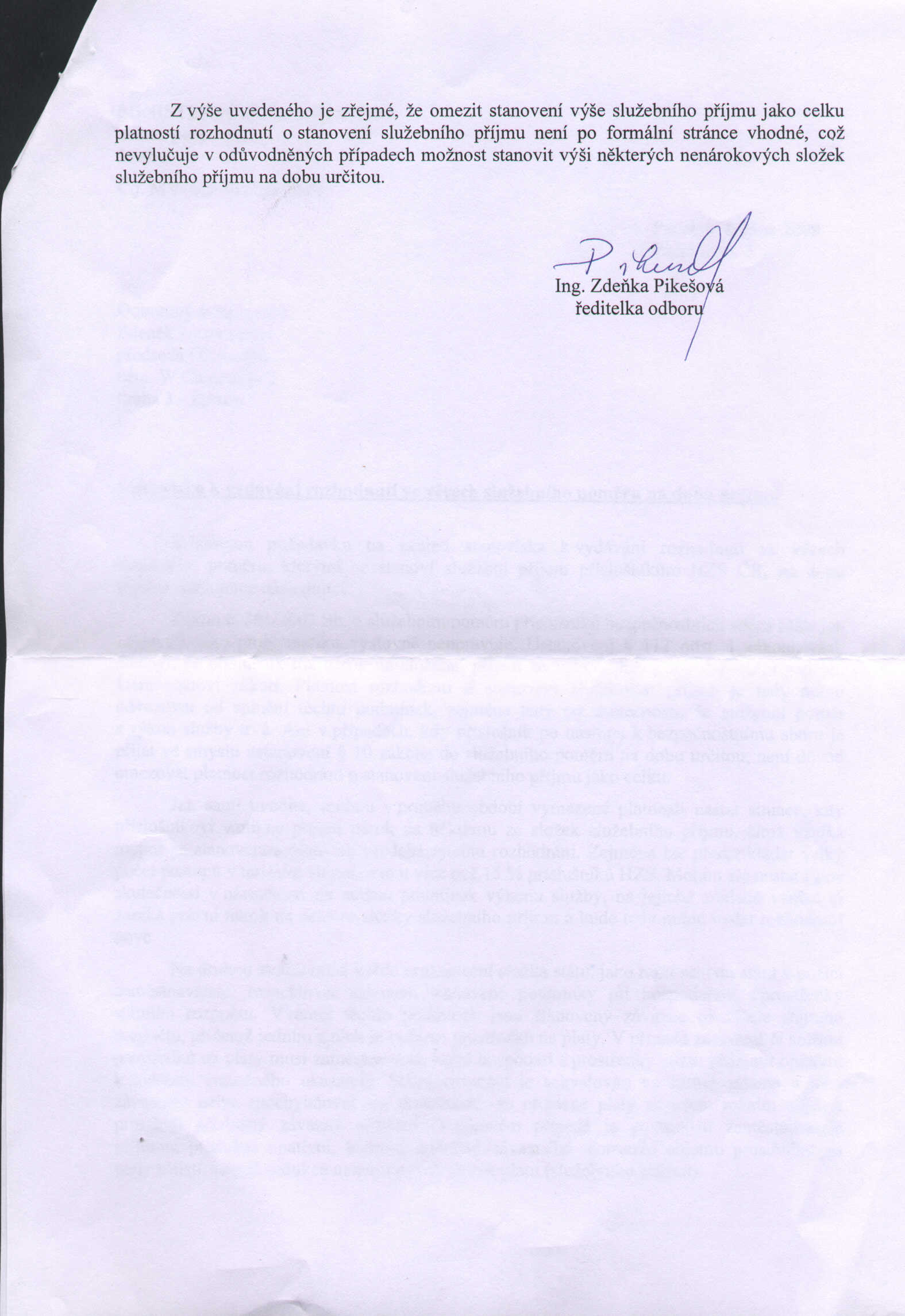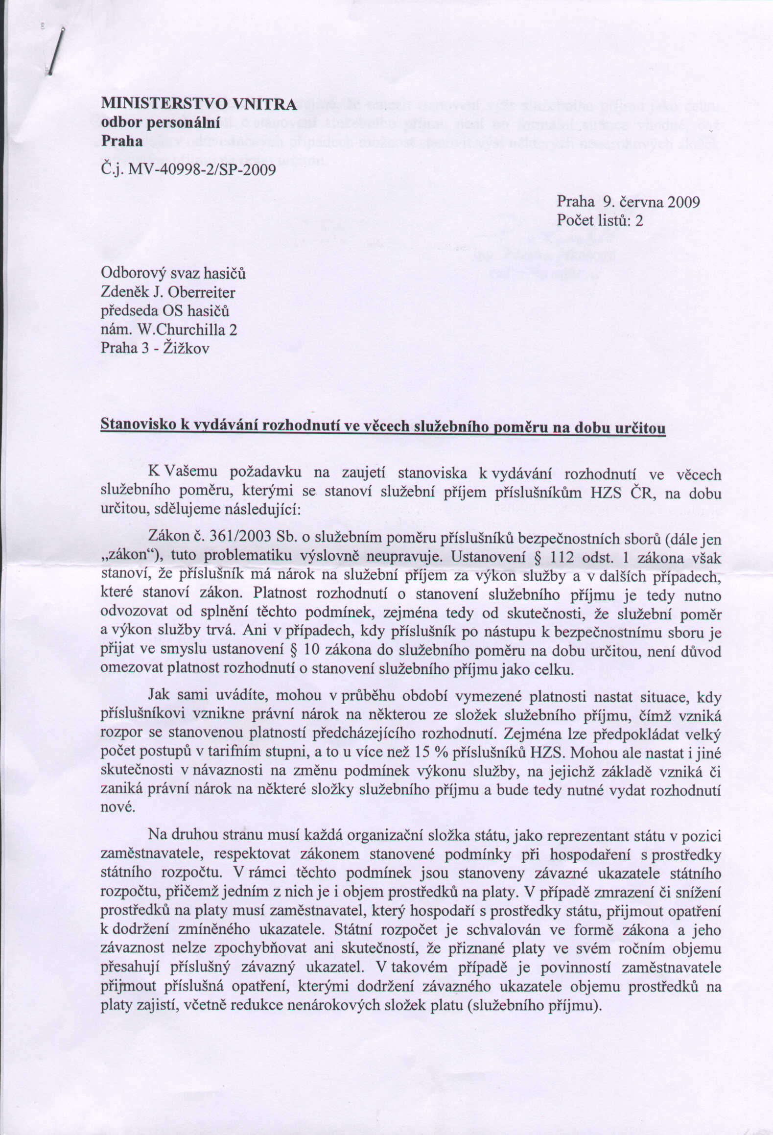 Včera jsme jednali s ředitelkou odboru personálního MV paní Ing. Pikešovou a jejími kolegy ke stanovisku, které jsme si vyžádali. Jednalo se o praktickou aplikaci personální práce v HZS ČR, konkrétně o rozhodnutí ve věci služebního poměru, které se týká stanovení služebního příjmu od 1.6. 2009 na dobu určitou do 31.12. 2009. Písemné stanovisko, které zveřejňujeme, bylo při jednání se zaměstnanci zmíněného odboru komentováno v odpovědích na naše doplňující dotazy ve smyslu, který jsme seřadili takto: